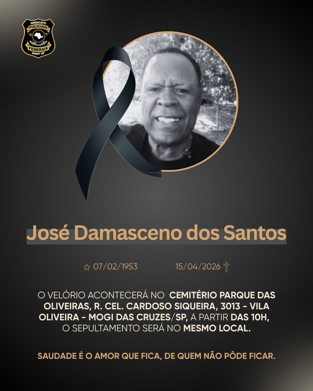 O SINPF/SP manifesta suas mais sinceras condolências aos familiares e amigos de José Damasceno, desejando força e serenidade neste momento de dor.